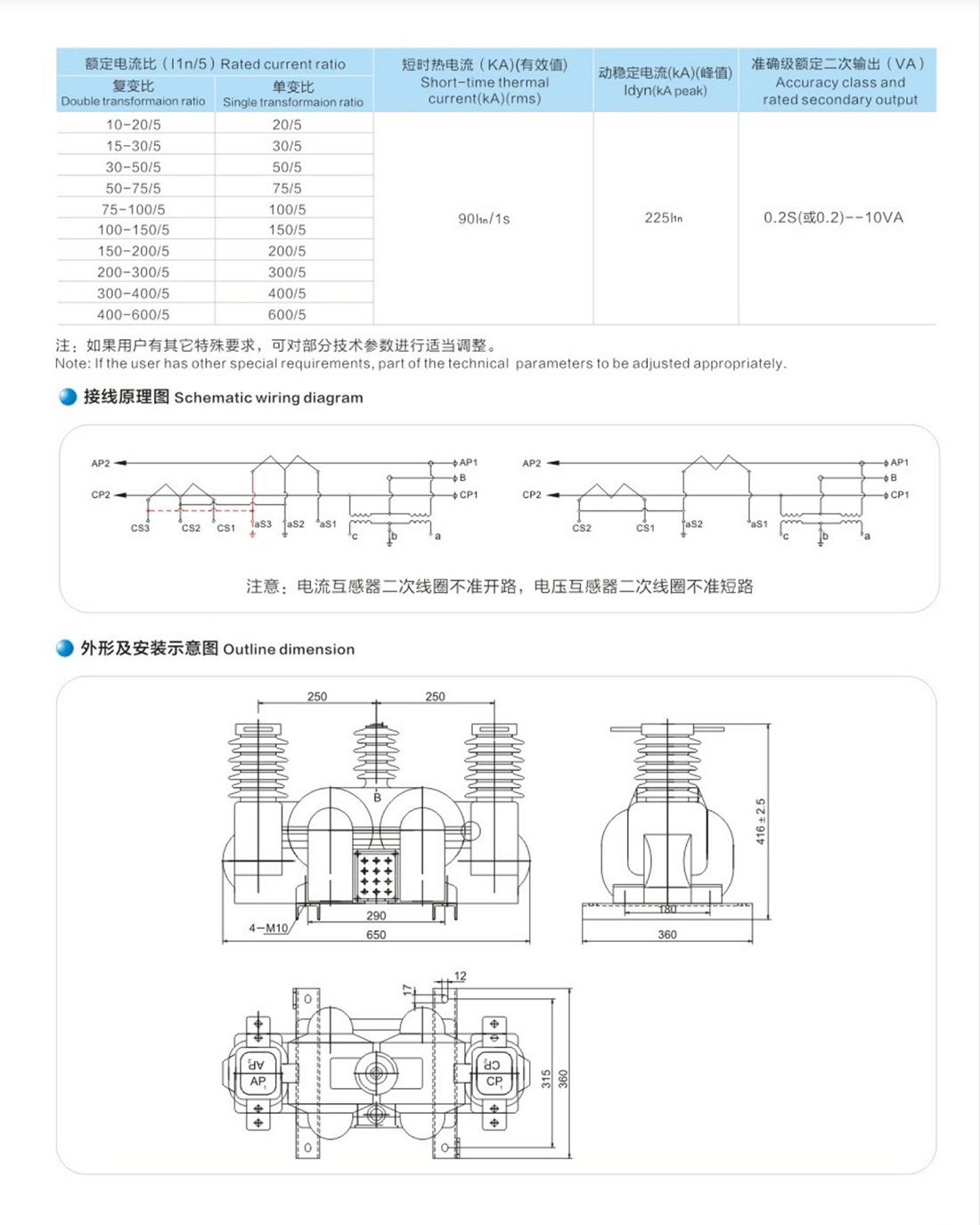 - 概述:本型電壓、電流組合互感器系供交流50Hz.額定電壓I0KV三 相線路中,作為電壓、電流和電能測量和繼電保護用。適用于工業(yè)企業(yè)小型變配電所及箱式變電站之用。組合互感器由戶外專用環(huán)氫樹脂真空澆注成型,體積小巧,具有高動熱穩(wěn)定、高精度、低磁密、耐過電壓、重量輕、安裝方便等特點。電流互感器二次繞組帶有抽頭可得到不同電流比。二次出線端有接線保護盒:其下方有出線孔,接線方便,安全可靠并能實現(xiàn)防竊電措施。底座槽鋼上有四個安裝孔供安裝使用。